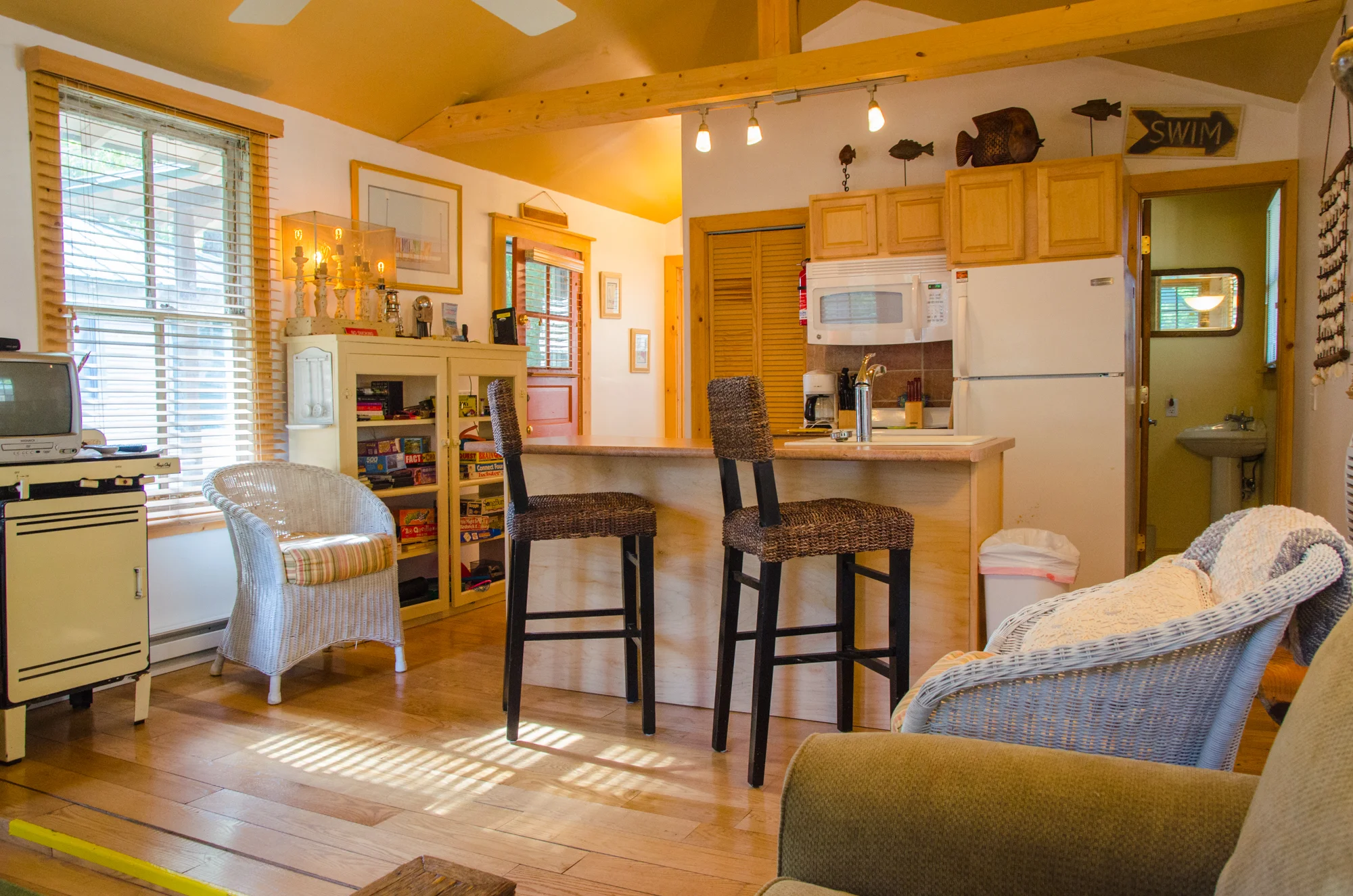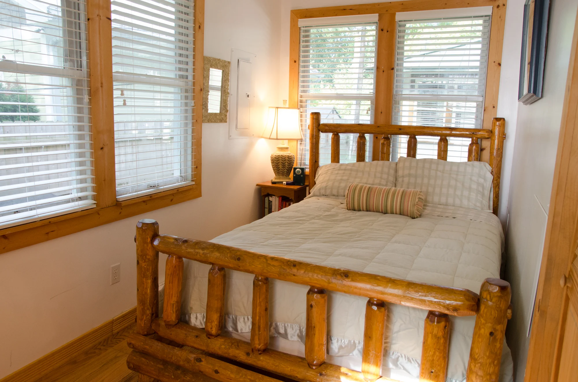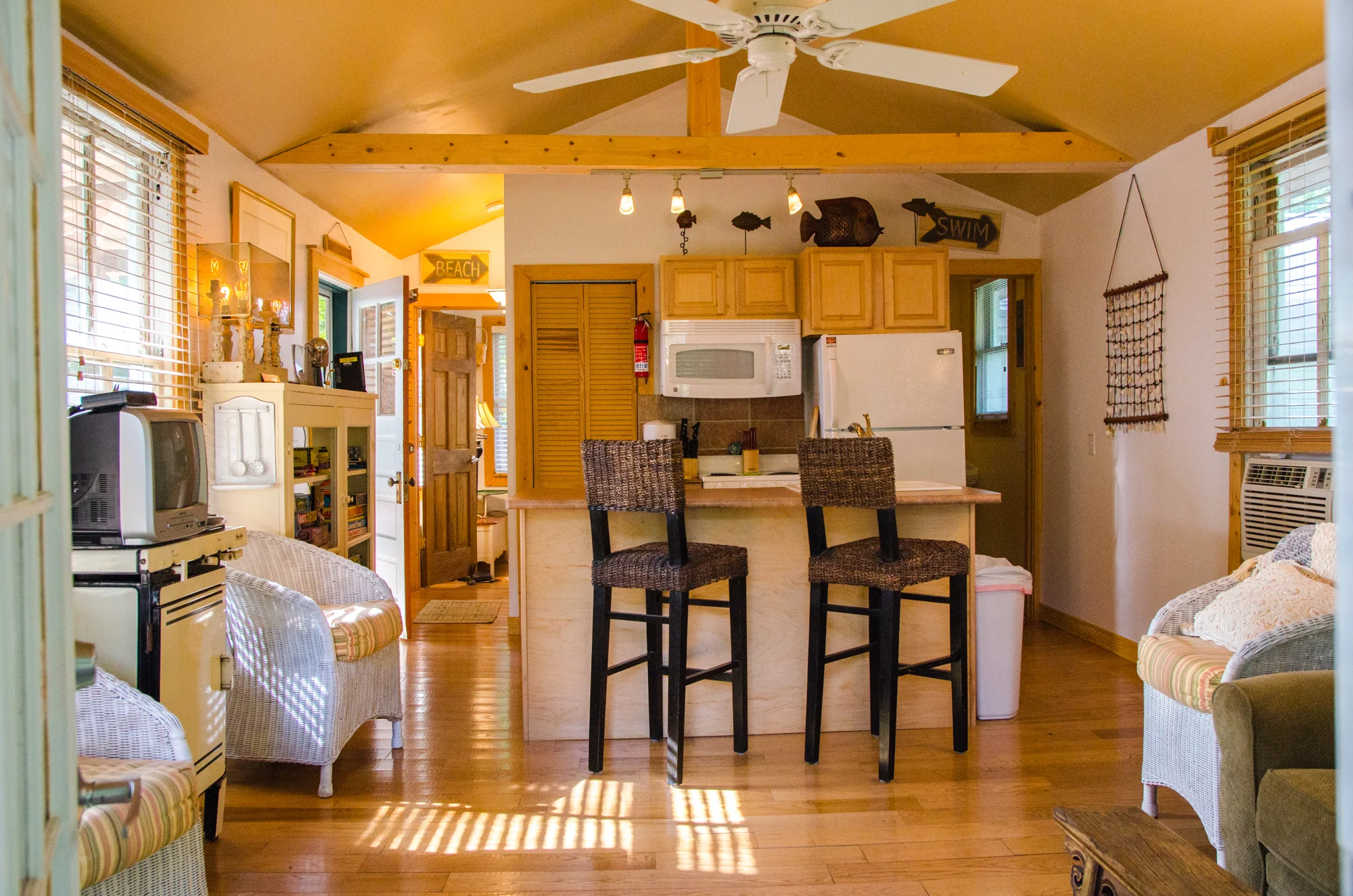 The one bedroom Herron is perhaps our most welcoming Villa also built nearly 100 years. ago. The Herron’s hardwood floors and vaulted ceilings will make you feel right at home. Like all of the Villas you have everything you need for indoor and outdoor cooking. The dining island flows into the great rooms and between the wicker chairs and again handcrafted cabinet and lights the Herron says “welcome to the beach”. The bedroom is graced with a hand crafted red cedar headboard and footboard. You can’t help to notice all of the details with your total comfort in mind.